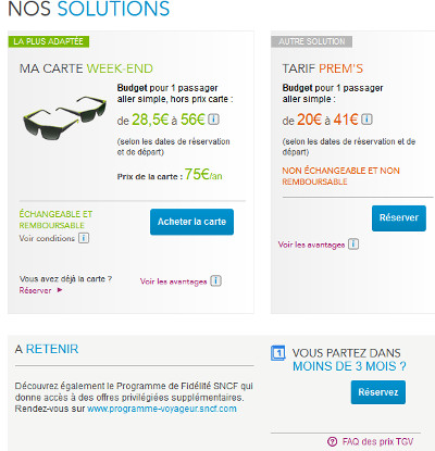 Une fois toutes ces informations saisies, Voyages-SNCF vous propose un récapitulatif avec les solutions les plus adaptées en fonction de vos habitudes de voyage. Voici un exemple pour une personne âgée de 28 à 59 ans qui a l’habitude d’avoir des dates de voyages fixes, qui effectue 12 allers-retours par an et qui réserve ces billets entre 1 mois et 15 jours avant le départ.