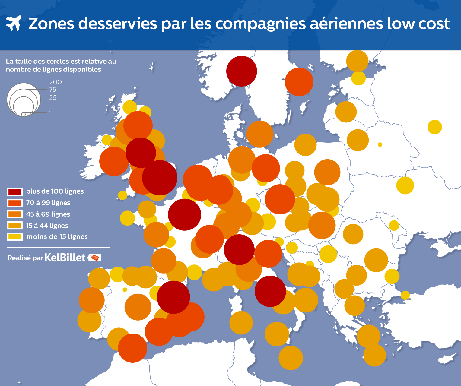 KelBillet.com a analysé les lignes proposées par les compagnies low cost en Europe afin de créer une carte des zones les mieux et les moins bien desservies. Les zones les mieux desservies étant celles bénéficiant du plus grand nombre de vols, opérés par des compagnies aériennes low cost, au départ de leurs aéroports.