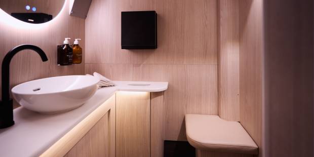 Au niveau inférieur, les voyageurs auront accès à des salles de bains (sans douche), à des vestiaires et à un espace snack pour se restaurer.
