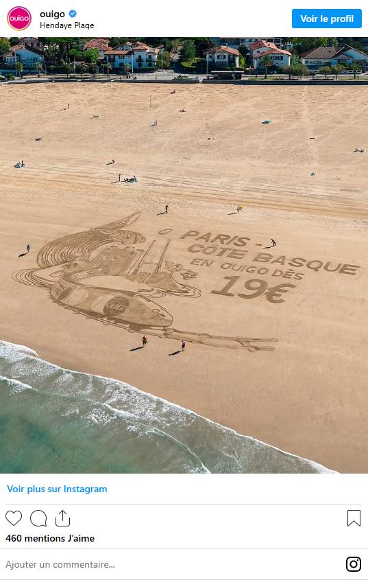 Pour faire connaitre sa nouvelle ligne entre Paris et la Côte Basque, la compagnie de train OUIGO réalise une publicité géante inédite sur la plage d’Hendaye ! Un joli coup de communication.
