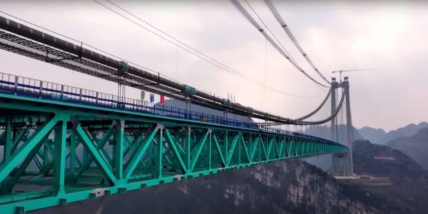 La hauteur du pont impressionne ! 625 mètres, c’est deux fois la hauteur de la Tour Eiffel et presque le double du viaduc de Millau ! La travée principale, longue de 1 420 mètres, relie deux montagnes et surplombe la rivière Beipan. Avec ses 2 890 mètres de longueur totale, il bat aussi le record du plus long pont en région montagneuse.